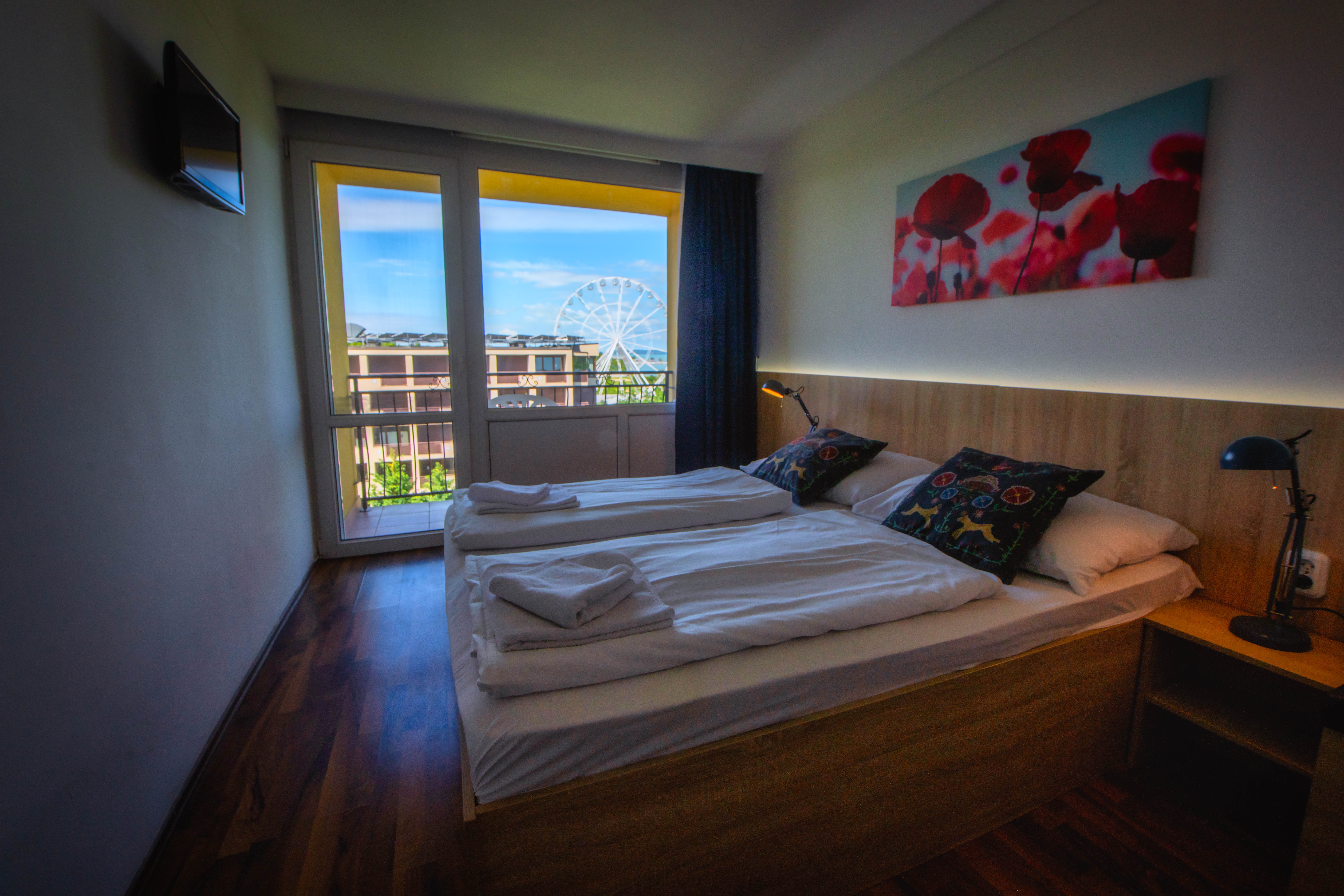 Das Hotel vermietet 132 Doppelzimmer mit Badezimmer und einfache Möbel, Doppelbett, Fernseher und Kühlschrank ausgestattet, alle mit Seeblickbalkonen. Ein Badezimmer mit Dusche und Toilette sind für die Gäste im Zimmer verfügbar. Zwischen diesen Räumen können Sie 12 Familienräume finden. Alle unsere Preise umfassen ein freies Buffetfrühstück und einen freien Zugang zu unserem privaten Strand. Parkplatz 400 m vom Hotel entfernt (kostenpflichtig).